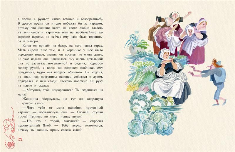 Сказка «Карлик Нос» повествует о хорошеньком избалованном мальчишке, который насмеялся над уродством старого человека и в результате сам стал уродцем, над которым смеются окружающие. Поэтично и трогательно сказку проиллюстрировала известный художник Ника Гольц.