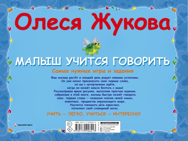 Рассматривая яркие рисунки, выполняя простые задания, собранные в этой книге, малыш быстро начнёт говорить свои первые слова — названия членов своей семьи, животных, предметов окружающего мира. Научится понимать речь взрослых, пополнит свой словарный запас.