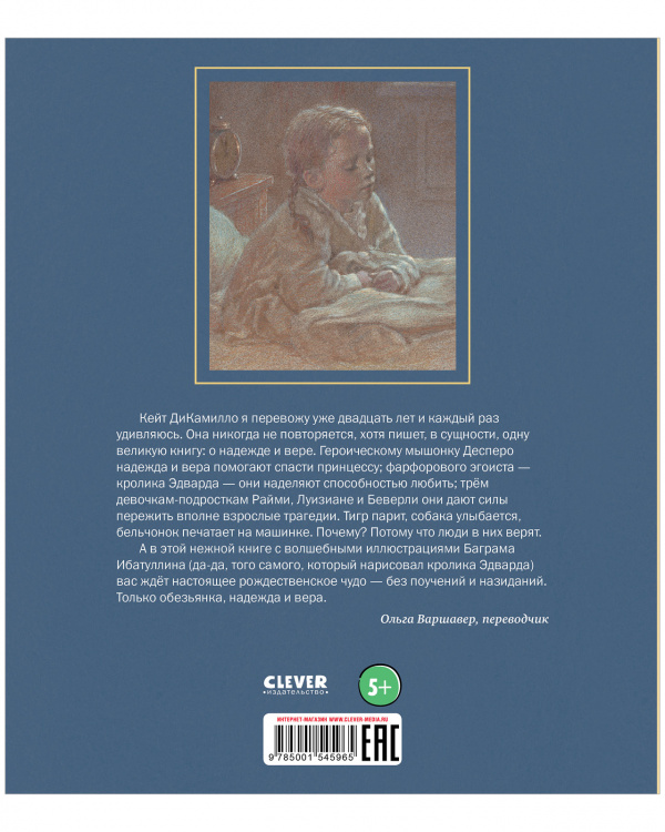 «Кейт ДиКамилло я перевожу уже двадцать лет и каждый раз удивляюсь. Она никогда не повторяется, хотя пишет, в сущности, одну великую книгу о надежде и вере. Героическому мышонку Десперо надежда и вера помогают спасти принцессу; фарфорового эгоиста — кролика Эдварда — они наделяют способностью любить; трем девочкам-подросткам Райми, Луизиане и Беверли они дают силы пережить вполне взрослые трагедии. Тигр парит, собака улыбается, бельчонок печатает на машинке. Почему? Потому что люди в них верят. А в этой нежной книге с волшебными иллюстрациями Баграма Ибатуллина (да-да, того самого, который нарисовал кролика Эдварда) вас ждет настоящее рождественское чудо — без поучений и назиданий. Только обезьянка, надежда и вера», Ольга Варшавер, переводчик.