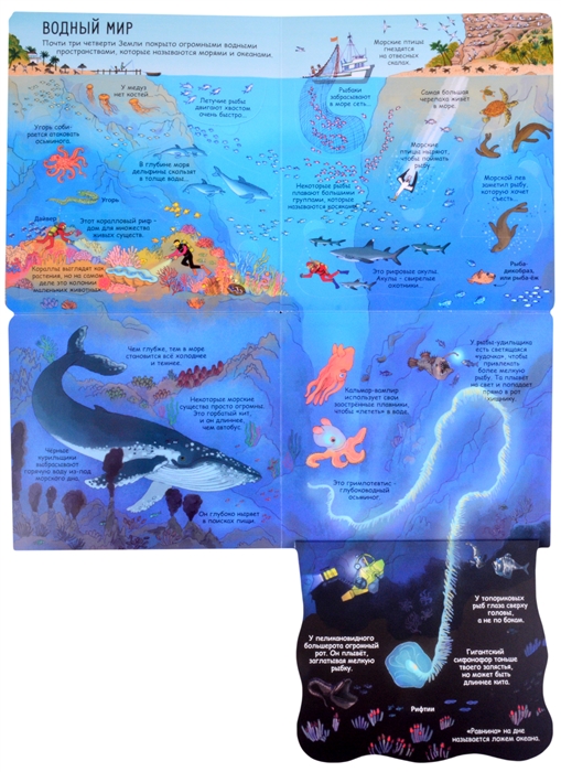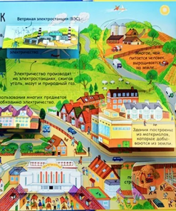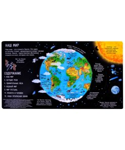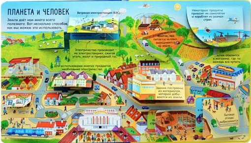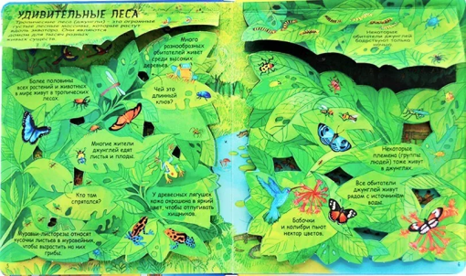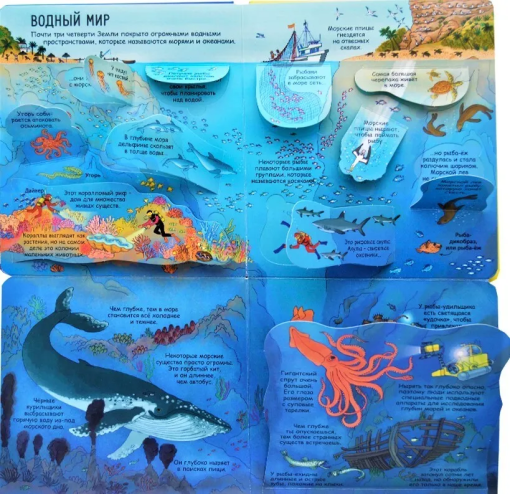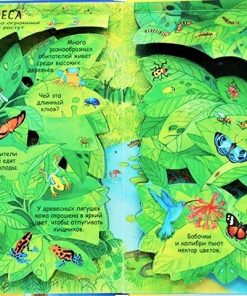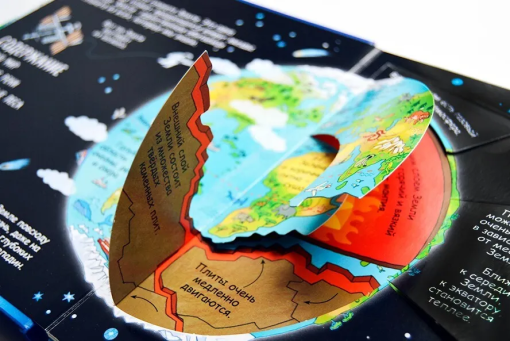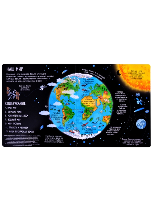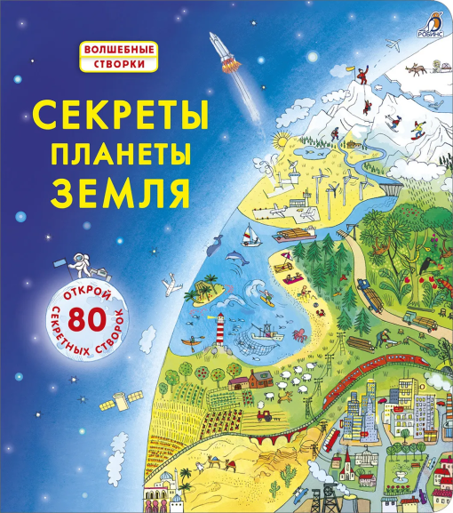 Яркие и детальные иллюстрации, а также более 80 створок, за которыми спрятано множество интересных фактов о жизни на Земле, самых жарких и холодных местах планеты, об обитателях тропических лесов и подводных глубин и множестве других интересных фактов о нашей планете.