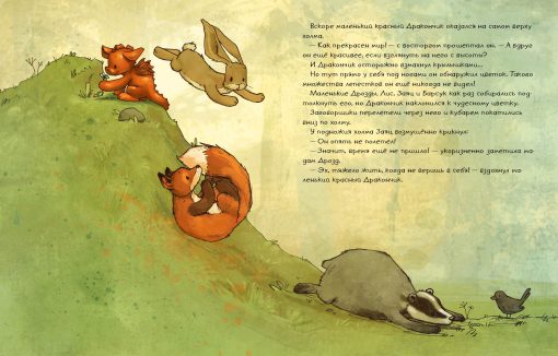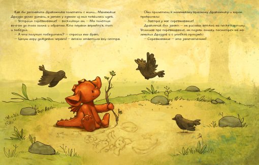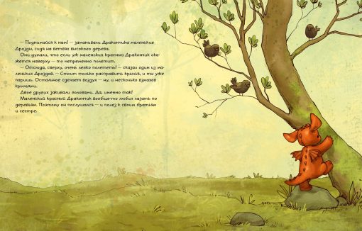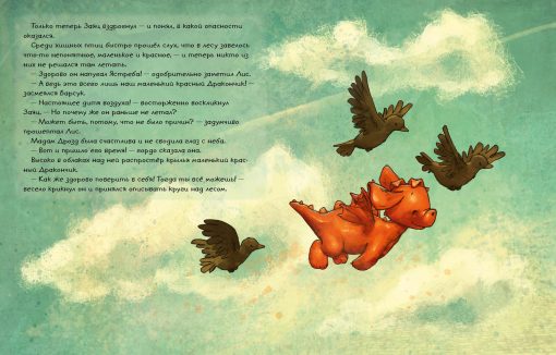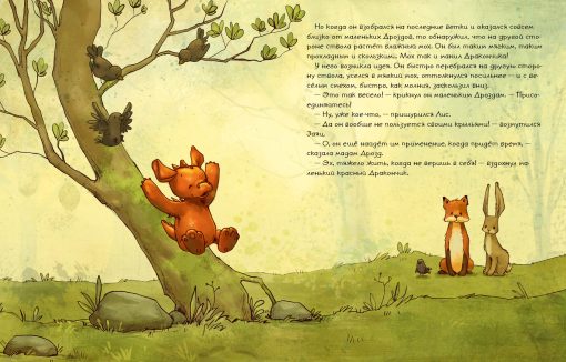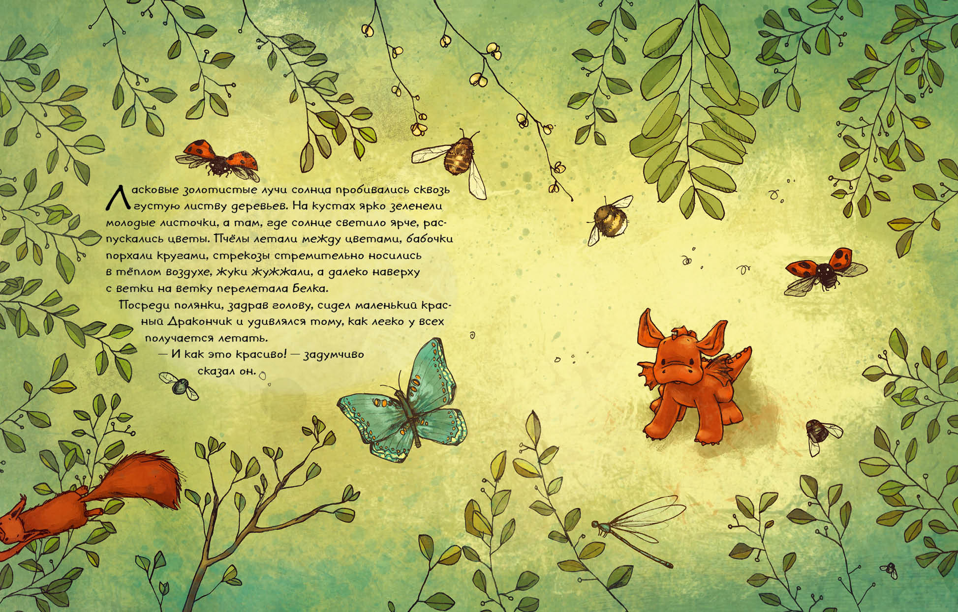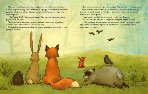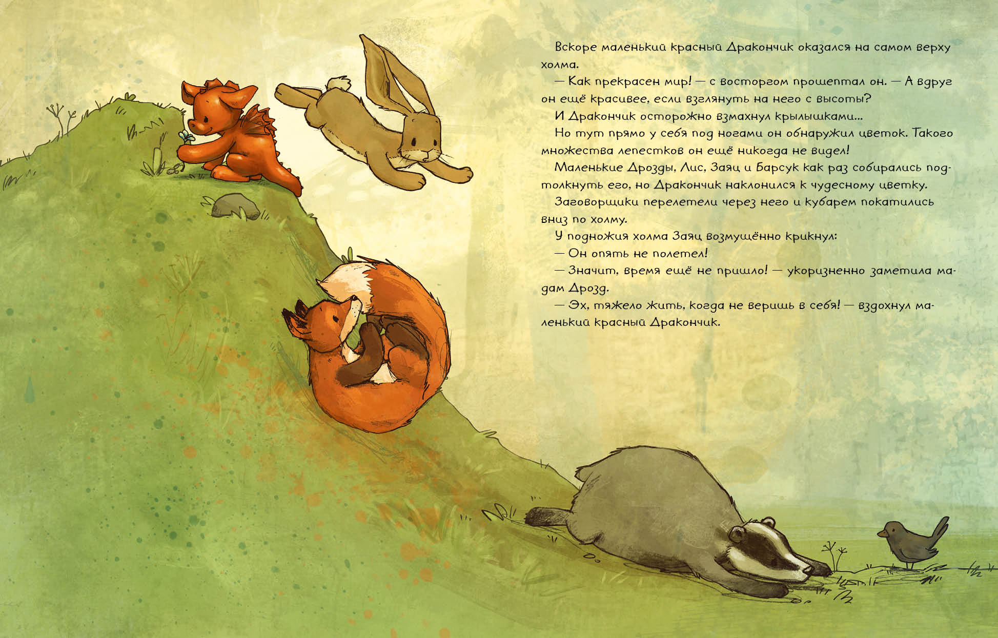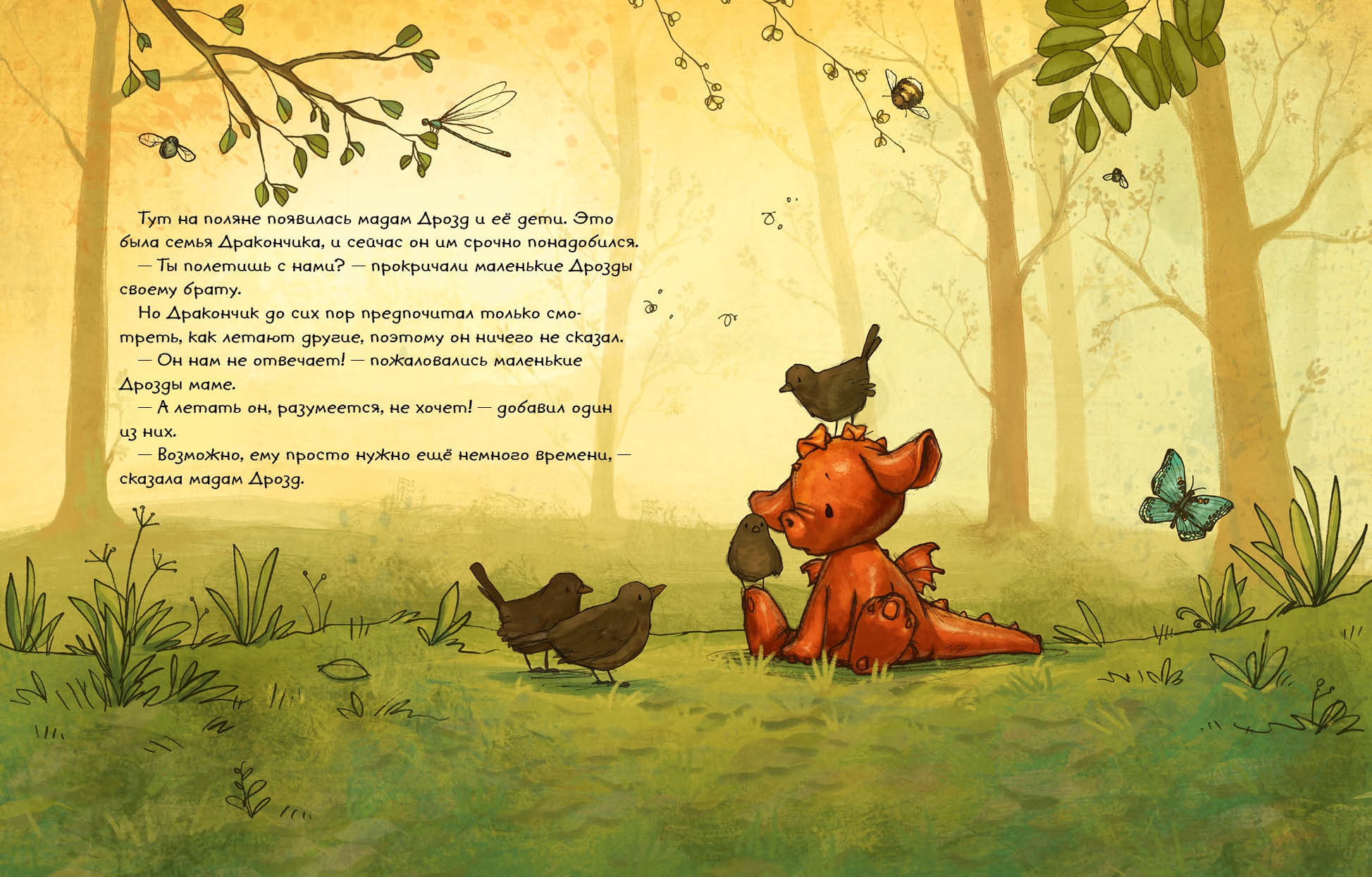 Маленькие Дрозды целыми днями летают наперегонки – они уже совсем выросли. А что же Дракончик? Он только смотрит на игры своих братьев и сестры и никак не может решиться – ему кажется, что топать по земле намного безопаснее, чем парить в облаках… Семья и друзья стараются помочь ему – ведь так здорово поверить в себя!