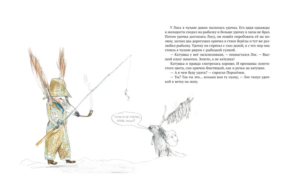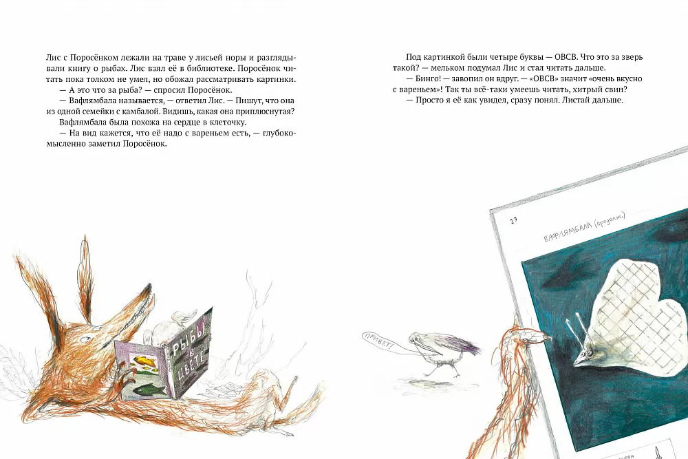 Очередное приключение Лиса и Поросёнка началось с книги о рыбах, которую они рассматривали. Каких только рыб там не было! Горлодёр и двуголавль, ржавчник и карпофель, шилозад и дымойва… Но всех их затмила прекрасная вафлямбала. Похожая на сердце в клеточку, аппетитная, как вафля, хоть с вареньем ешь, — как тут устоять!