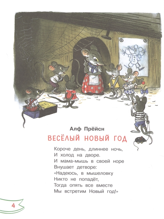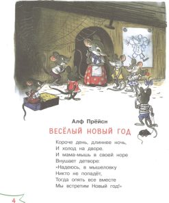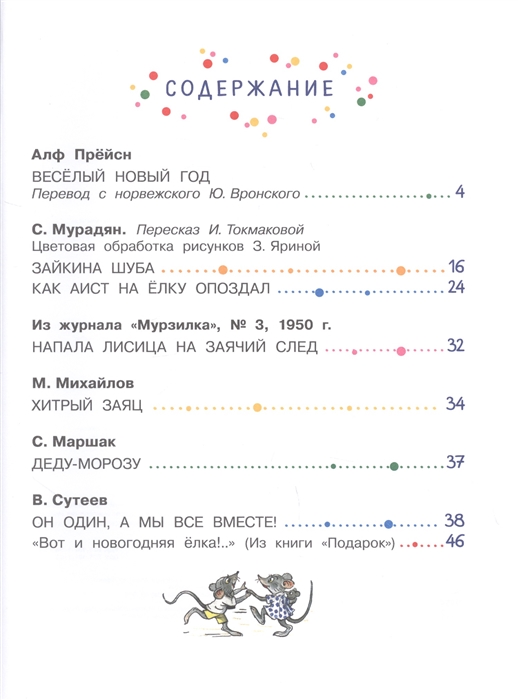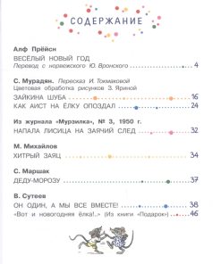 В книгу вошли новогодние истории в стихах: “Весёлый Новый год” Алфа Прёйсена, “Как аист на ёлку опоздал” Сурена Мурадяна, “Дед Мороз несёт мешок” из Платона Воронько и другие. Стихи и сказки в стихах подарят новогоднее настроение. Представить новогодний праздник в ярких красках помогут рисунки художника-сказочника Владимира Сутеева.